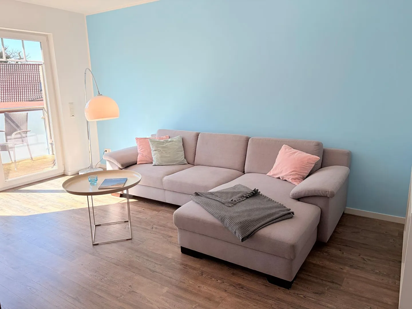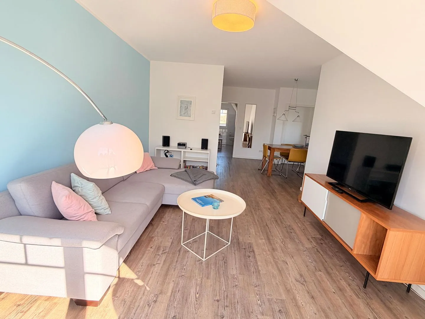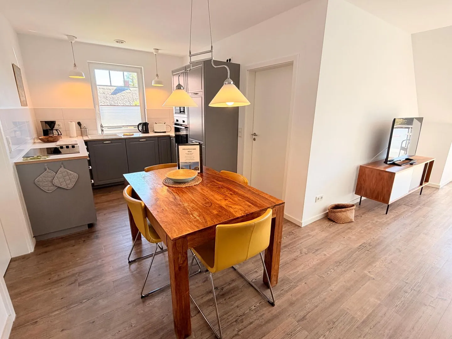 Die 59 m² große Wohnung befindet sich im Obergeschoss eines ökologisch gebauten Hauses mit vier Einheiten und ist über ein gemeinschaftliches Treppenhaus erreichbar. Sie bietet einen hellen Wohnbereich mit angrenzender, voll ausgestatteter Küche und Essplatz – ideal für gemeinsame Urlaubsabende.